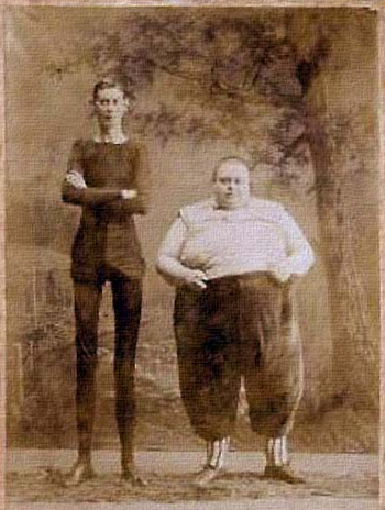 Image: publicity photo of Fred Howe and George Moore, sideshow performers of the late 19th century. Howe (the Fat Man) and Moore (the Human Skeleton) were part of the Forepaugh Circus, where they performed a comical boxing routine.